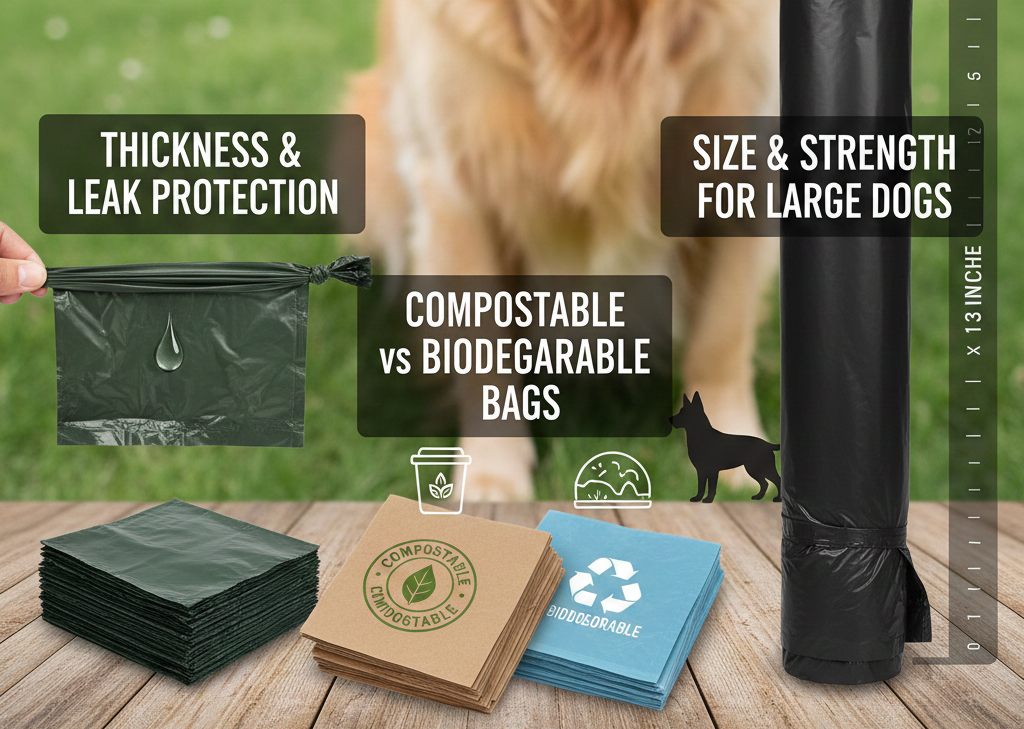 Next, consider whether you want compostable vs biodegradable bags. Compostable bags break down in specific conditions like industrial composting facilities. Biodegradable bags may break down more slowly but still reduce long-term impact. Lastly, if you walk large dogs, you want size & strength for large dogs. Bigger, stronger bags make outdoor cleanup easier and cleaner for every walk.